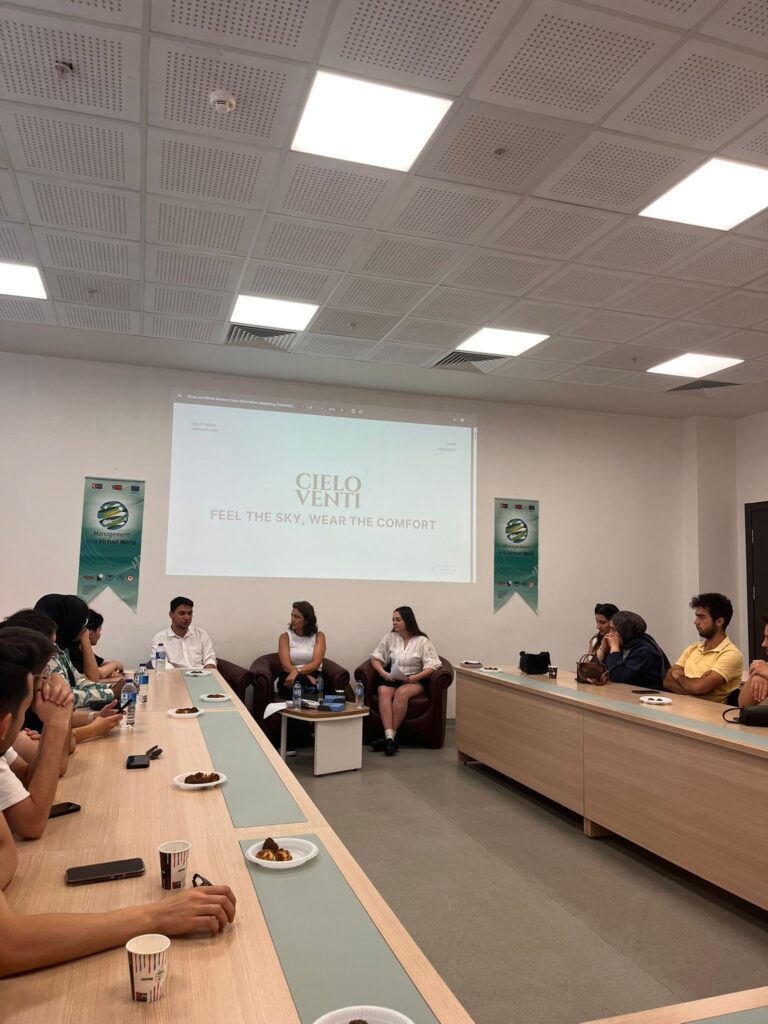 Management in a Virtual World projemizin son konferans etkinliğinde yeni bir tekstil firması olan Cielo Venti’nin girişimcilerini 26 Haziran 2025 Perşembe günü öğrencilerimizle buluşturduk. Cielo Venti’nin girişimcilerinden Gül Eryılmaz, markanın kuruluş hikayesini, vizyon ve misyonunu öğrencilerle paylaştı. Markaya ilişkin pazara giriş stratejileri, rekabet yetenekleri ve geleceğe ilişkin hedefleri detaylı bir şekilde anlatıldı, ürün örnekleri öğrencilere gösterildi. Öğrenciler bu yeni girişime büyük ilgi gösterdiler ve konferansın sonunda sorularını Cielo Venti girişimcilerine yönelttiler. Soru-cevap bölümünden sonra Cielo Venti girişimcilerine teşekkür belgeleri takdim edildi.